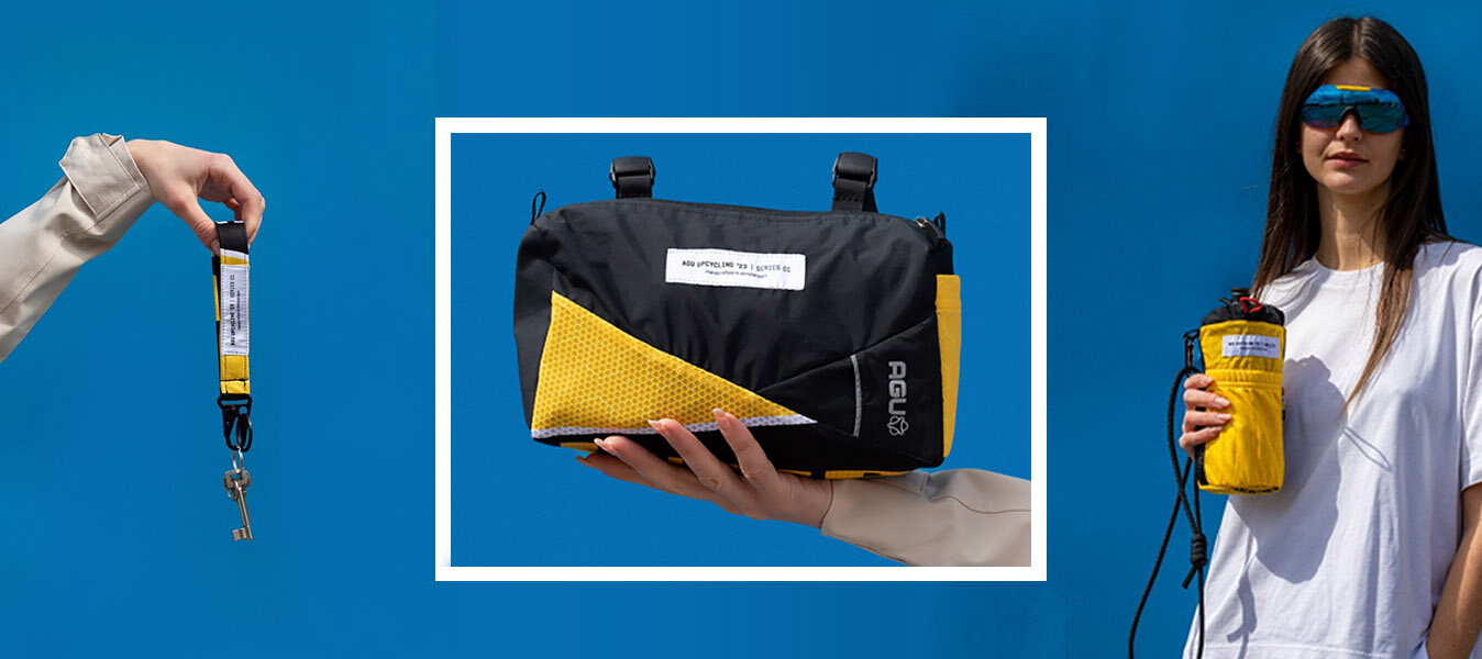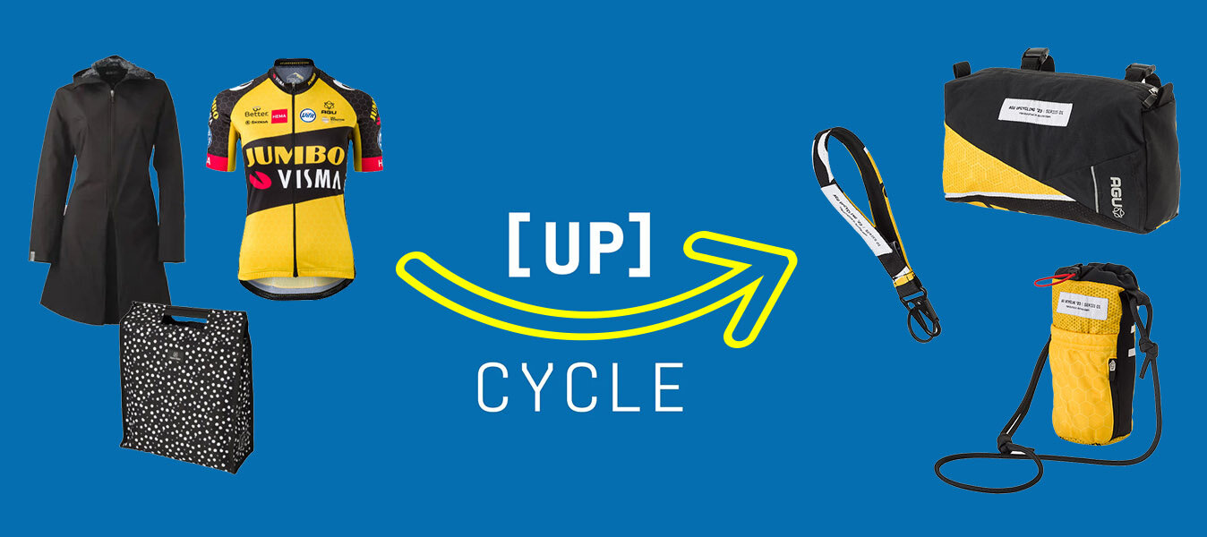 Mit minimalem ökologischem Fussabdruck hat AGU überschüssige Bestände an Velotaschen, Team Jumbo-Visma 2022 Replica Trikots und Regenbekleidung der SEQ-Reihe, welche Herstellungsfehler aufwiesen, in einzigartige Produkte verwandelt.