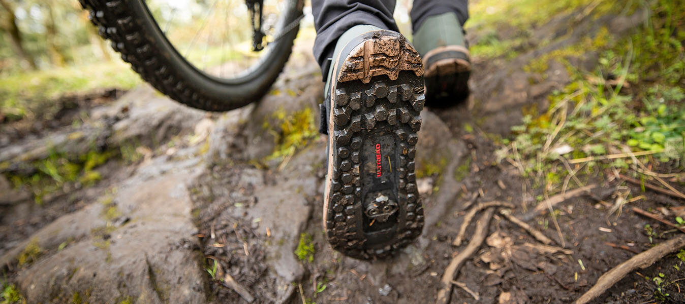 Extrem beansprucht und ganz selbstverständlich immer voll im Einsatz: Die Sohle eines Mountainbike-Schuhs ist für die Verbindung von Fahrerin oder Fahrer und Bike ausschlaggebend.
