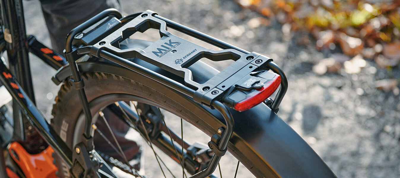 Ein weiteres cleveres Feature des Gepäckträgers ist die Adapterplatte «MIK» (Mounting is Key). Das Klicksystem macht die Befestigung von Velotaschen denkbar einfach, da sie sich ganz bequem auf dem Gepäckträger einrasten lassen. Die Velotaschen müssen dazu mit dem MIK-Adapter ausgestattet sein.