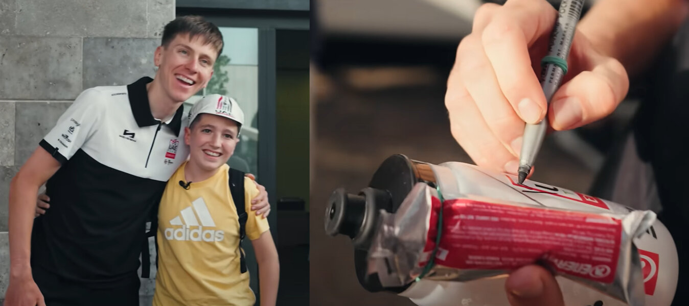 Die grösste Überraschung stand jedoch noch aus, denn plötzlich tauchte Tadej Pogačar auf und begrüsste Mattia vor Ort. Obwohl sein Zeitplan eng gesteckt war, nahm sich Pogačar die Zeit: Er signierte die Giro d’Italia-Flasche, posierte für gemeinsame Fotos und schenkte dem jungen Fan damit einen weiteren Moment, der Mattia wohl für immer in Erinnerung behalten wird.