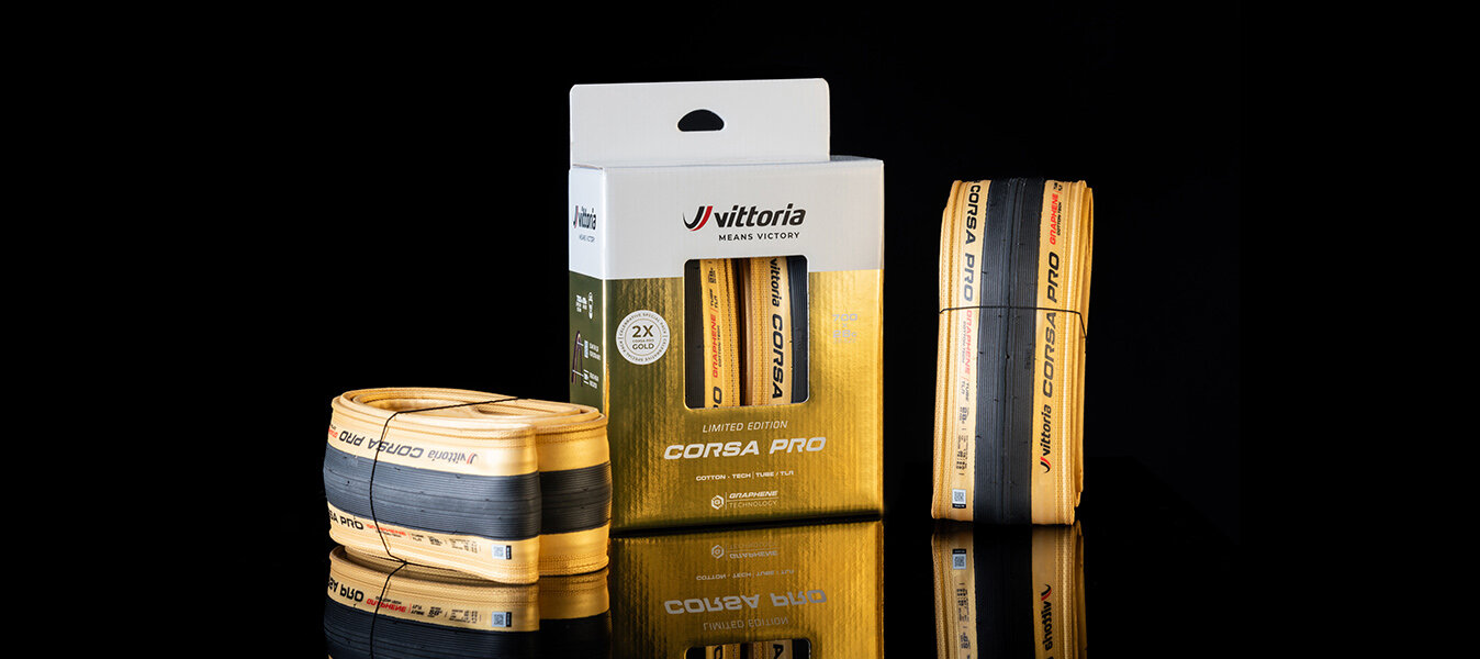 Der Corsa PRO Gold wird im Set mit zwei Corsa PRO Tubeless-Pneus und einer von Hand geschriebenen Seriennummer auf der Innenseite des Reifens geliefert. Weltweit sind nur 2023 Packungen erhältlich: ein echtes Sammlerstück für jeden Liebhaber des Strassenradsports!