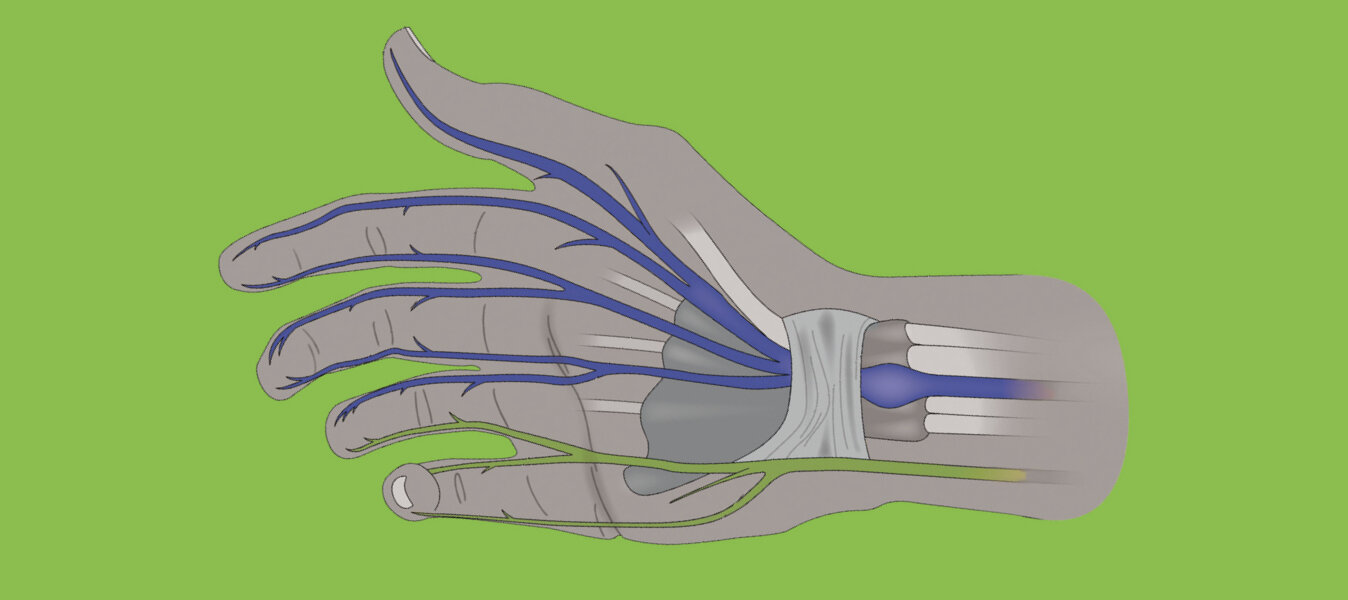 Eine zweite Problemquelle ist der Zentral-Nerv (Median-Nerv). Er verläuft durch einen schmalen Tunnel im Handgelenk (Carpaltunnel). Druck und das Abwinkeln der Hand führen hier zum bekannten Carpaltunnelsyndrom. Das Carpaltunnelsyndrom führt zu Taubheitsgefühl und Schwächen an Daumen, Mittel- und Zeigefinger. In schweren Fällen verschwindet das Taubheitsgefühl erst lange nach der Velotour oder wird über Nacht schlimmer, da das Gewebe der Hand dazu tendiert, nachts leicht anzuschwellen.