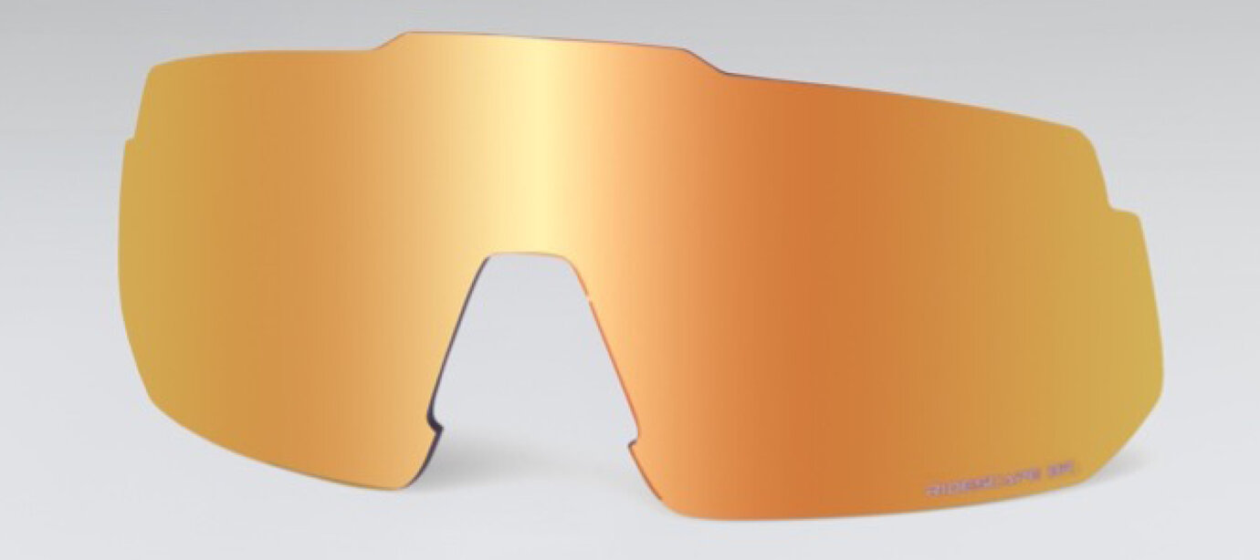 Die Gläser mit ihrer goldfarbenen Verspiegelung lassen Farben lebendiger und Details schärfer erscheinen. Dank einer Lichtdurchlässigkeit (VLT für Visible Light Transmission) von 13 % reduzieren sie die Blendung durch grellen Asphalt erheblich.