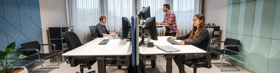 Wir wissen, dass Leistung nicht von ungefähr kommt. Entsprechend freuen wir uns alle über unser helles, zeitloses Gebäude wie auch die moderne Arbeitsplatzinfrastruktur.